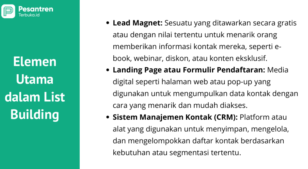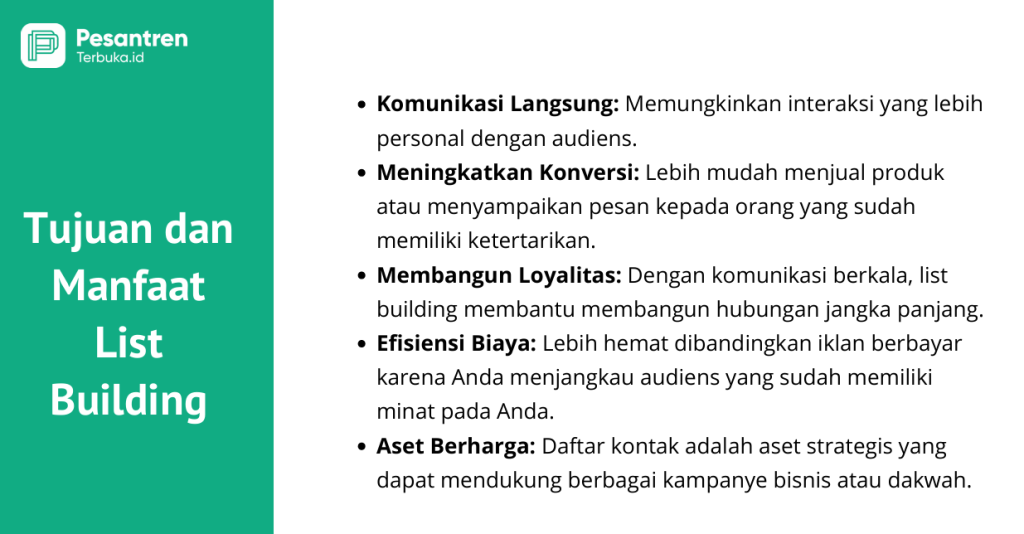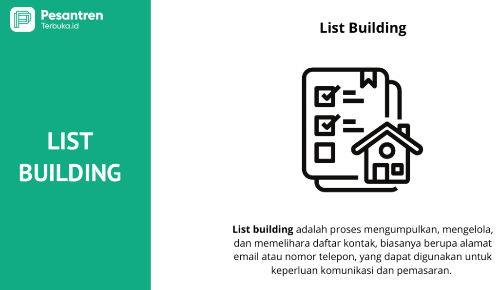 List building dalam dakwah Islam adalah strategi mengumpulkan data kontak (seperti email, nomor WhatsApp, atau Telegram) dari jamaah atau target audiens yang tertarik dengan konten dakwah, untuk kemudian dibina secara konsisten agar semakin dekat dengan nilai-nilai Islam. Ini adalah bentuk modern dari pendataan pengelompokan/segmentasi) untuk mempermudah komunikasi dan edukasi yang personal.