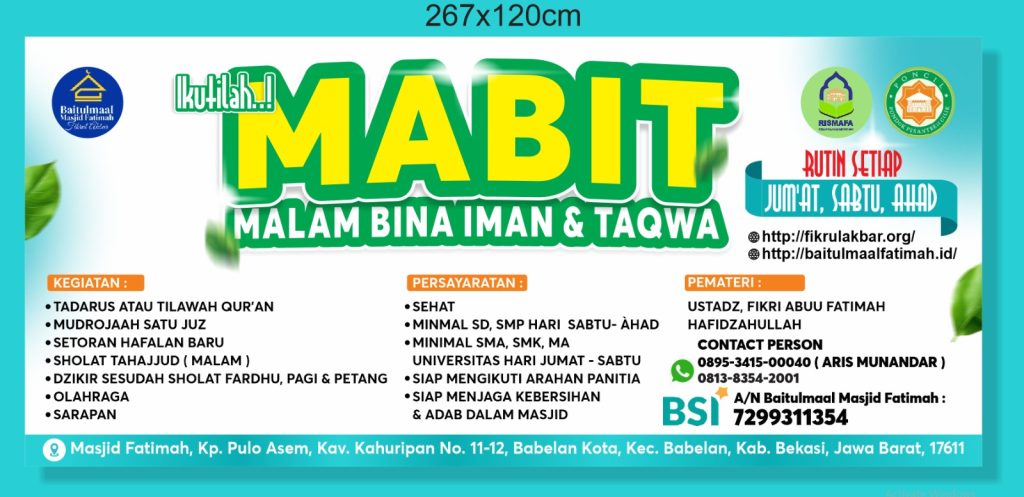 - Jamaah diharapkan hadir tepat waktu dan berpakaian sopan dan syar’i.